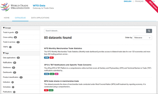 Trên trang chủ của Cổng Dữ liệu, người dùng có thể tìm kiếm các bộ dữ liệu theo chủ đề. Ví dụ, mục “Thương mại hàng hóa” cho phép truy cập thông tin liên quan đến thương mại hàng hóa trong khuôn khổ Hiệp định Chung về Thuế quan và Thương mại (GATT), trong khi các chủ đề mang tính liên ngành được nhóm trong mục “Vấn đề xuyên suốt”. Ngoài ra, cổng thông tin còn tích hợp thanh tìm kiếm để người dùng tra cứu trực tiếp theo từ khoá.